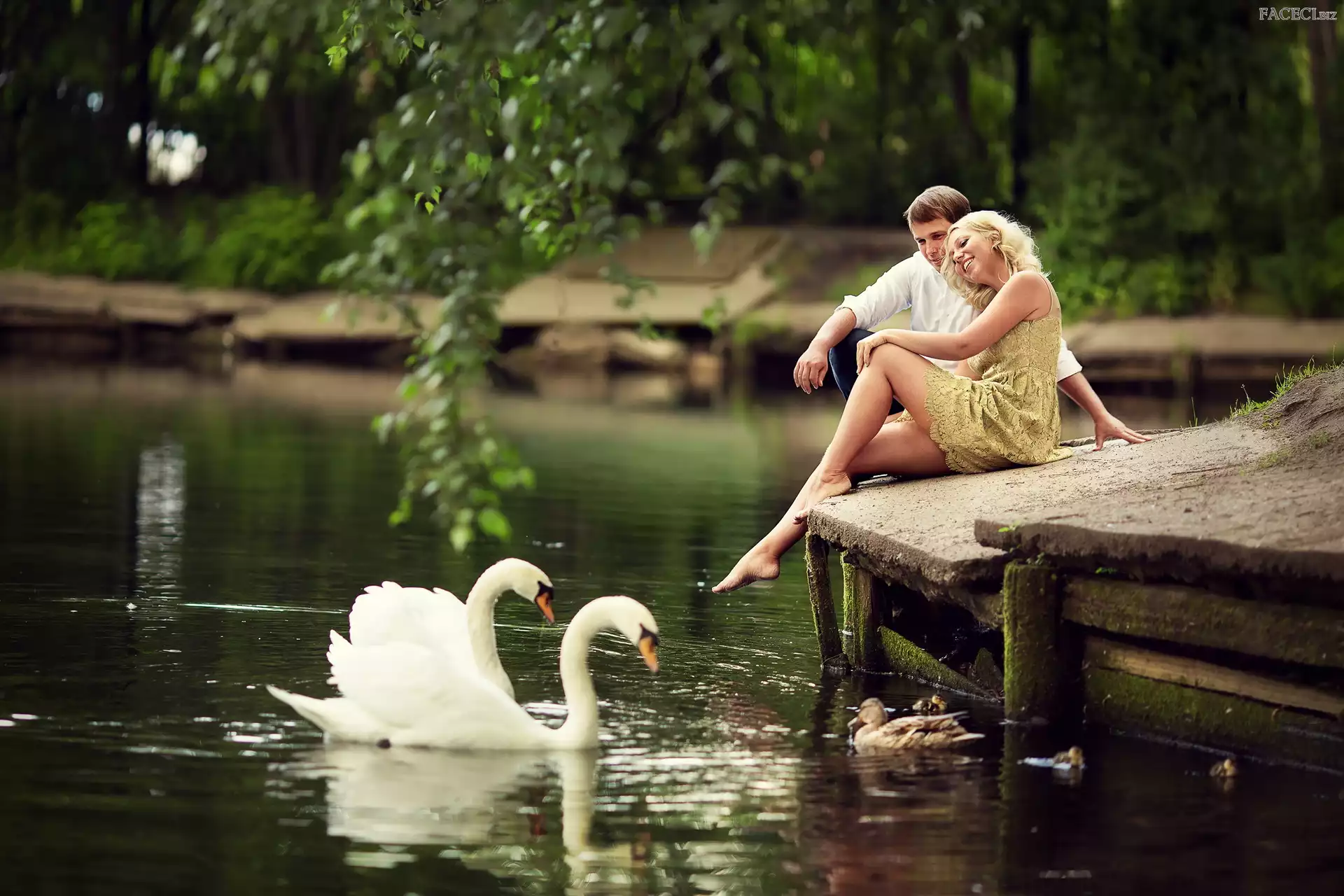 Łabędzie, Staw, Mężczyzna, Kobieta, Pomost - faceci.biz